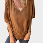 Parodykite savo kasdienį stilių su šiais nepaprastai patogiais marškinėliais natūralios rudos spalvos. Su laisvu siluetu ir diskretišku V formos iškirpimu, jie derina paprastumą ir eleganciją kiekvienai progai.