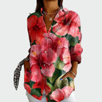 Ilgomis rankovėmis marškiniai su ryškiais gėlių raštais raudonos ir rožinės spalvos atspalviuose suteikia gyvybingumo ir vasariškos nuotaikos kiekvienam įvaizdžiui. Klasikinis apykaklė ir mygtukų užsegimas daro ją universalų pasirinkimą, puikiai tinkantį tiek kasdienėms, tiek elegantiškesnėms progoms.