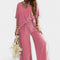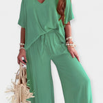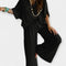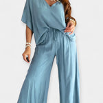 Šis komplektas yra atsipalaidavusios elegancijos įsikūnijimas. Plataus kirpimo kelnės su patogiais klešniais harmoningai derinamos su palaidine, turinčia V formos iškirpimą ir plačiomis rankovėmis – stilius, kuris kvėpuoja ir puošia bet kurią siluetą.