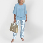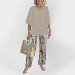 Modernus komplektas su patogia marškinėliais ir kelnėmis su raštais, idealiai tinka stilingoms išvaizdoms visą dieną. Marškiniai turi laisvą kirpimą, kuris puošia kiekvieną figūrą, o kelnės stebina subtiliais raštais.
