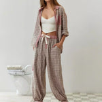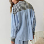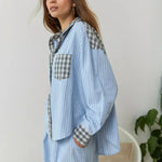Šis pižamų rinkinys siūlo unikalų elegancijos ir komforto derinį, su detalėmis, kurios išskiria jį iš kitų. Pilkai languoti akcentai ant apykaklės, kišenės ir rankogalių sukuria rafinuotą kontrastą su švelnia mėlyna spalva, suteikdami šviežią ir modernią išvaizdą.