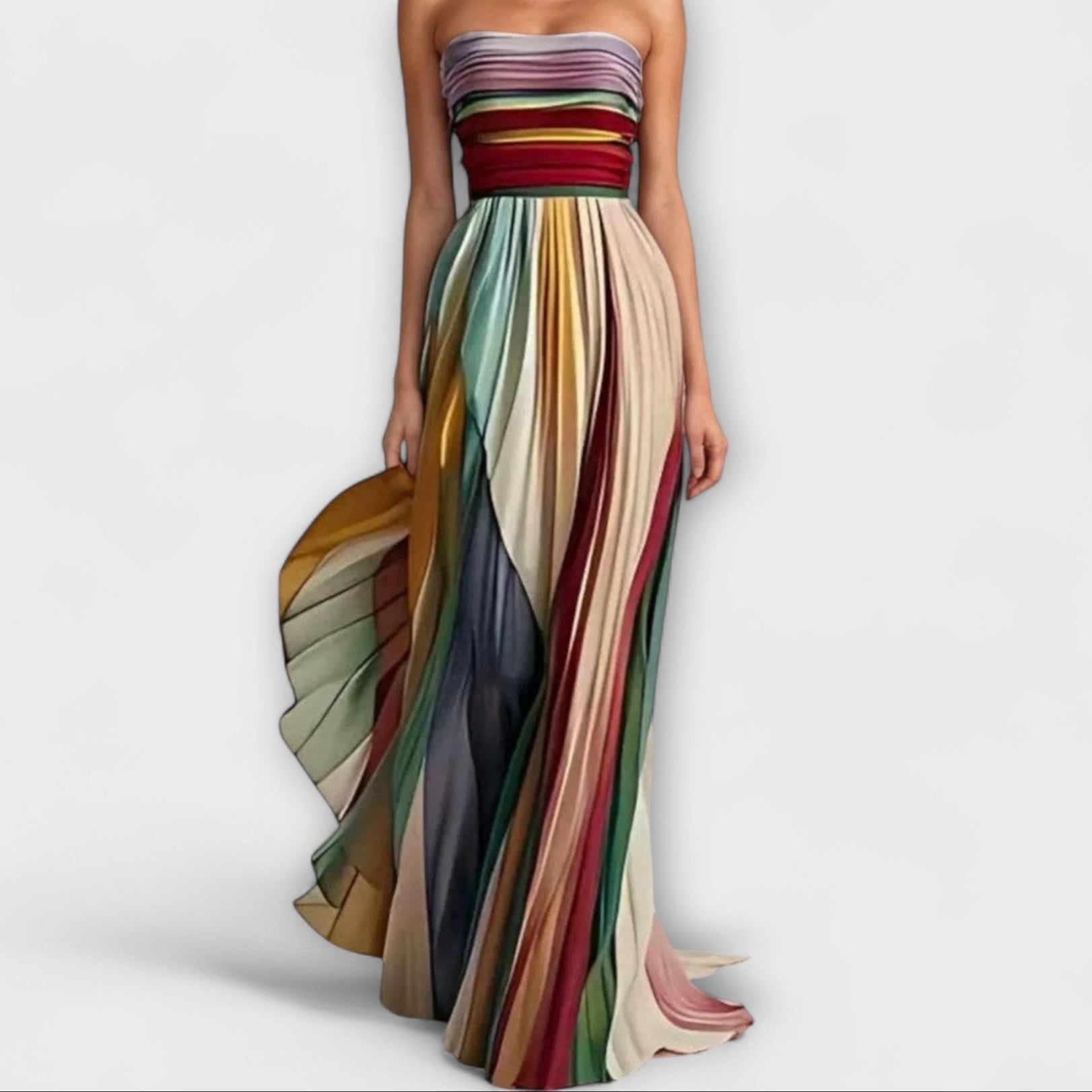 Magija yra spindinčios elegancijos sinonimas. Su savo petnešėlių neturinčiu dizainu ir spalvų palete, įkvėpta šiltų saulėlydžio tonų, ši suknelė lengvai ir stilingai apgaubia tavo siluetą. Lengva, patogi ir vizualiai kerinti – tai tobulas pasirinkimas išsiskirti šventėse, vakarienėse ar bet kuria proga, kai nori palikti spindinčios rafinuotumo įspūdį.