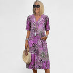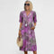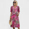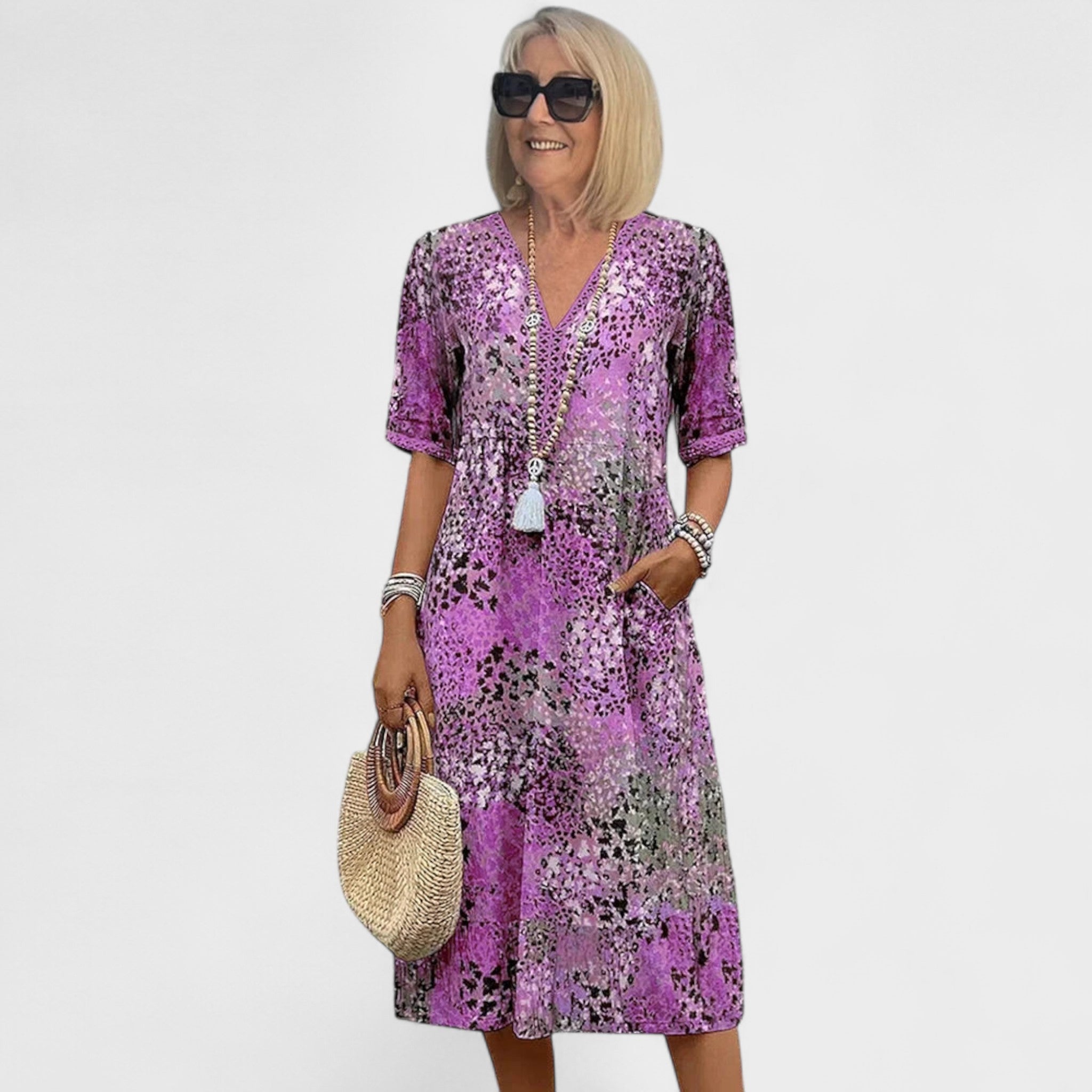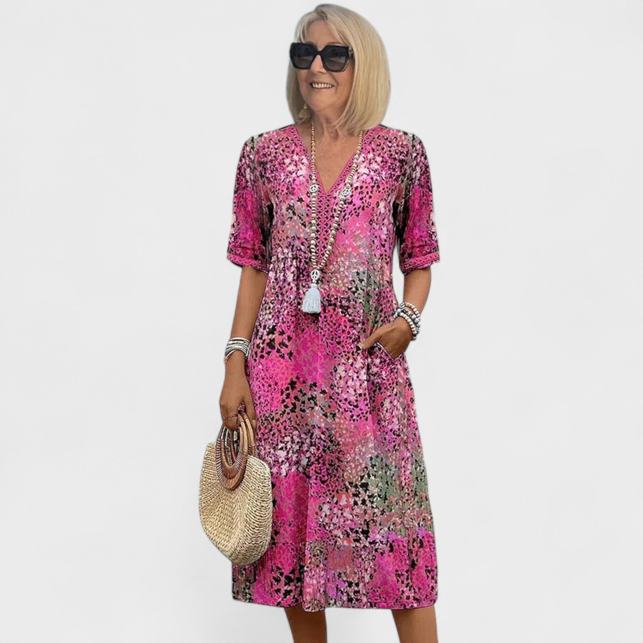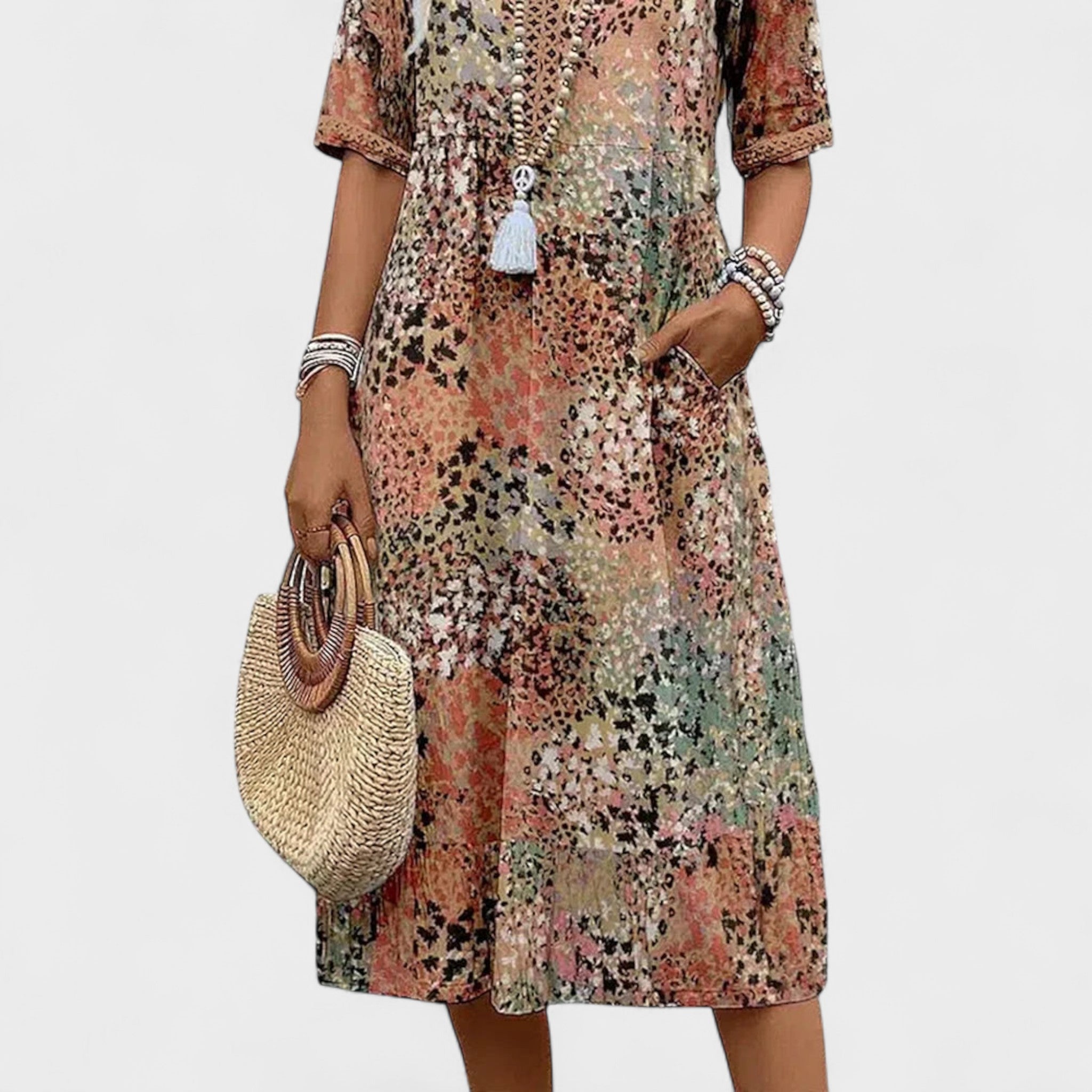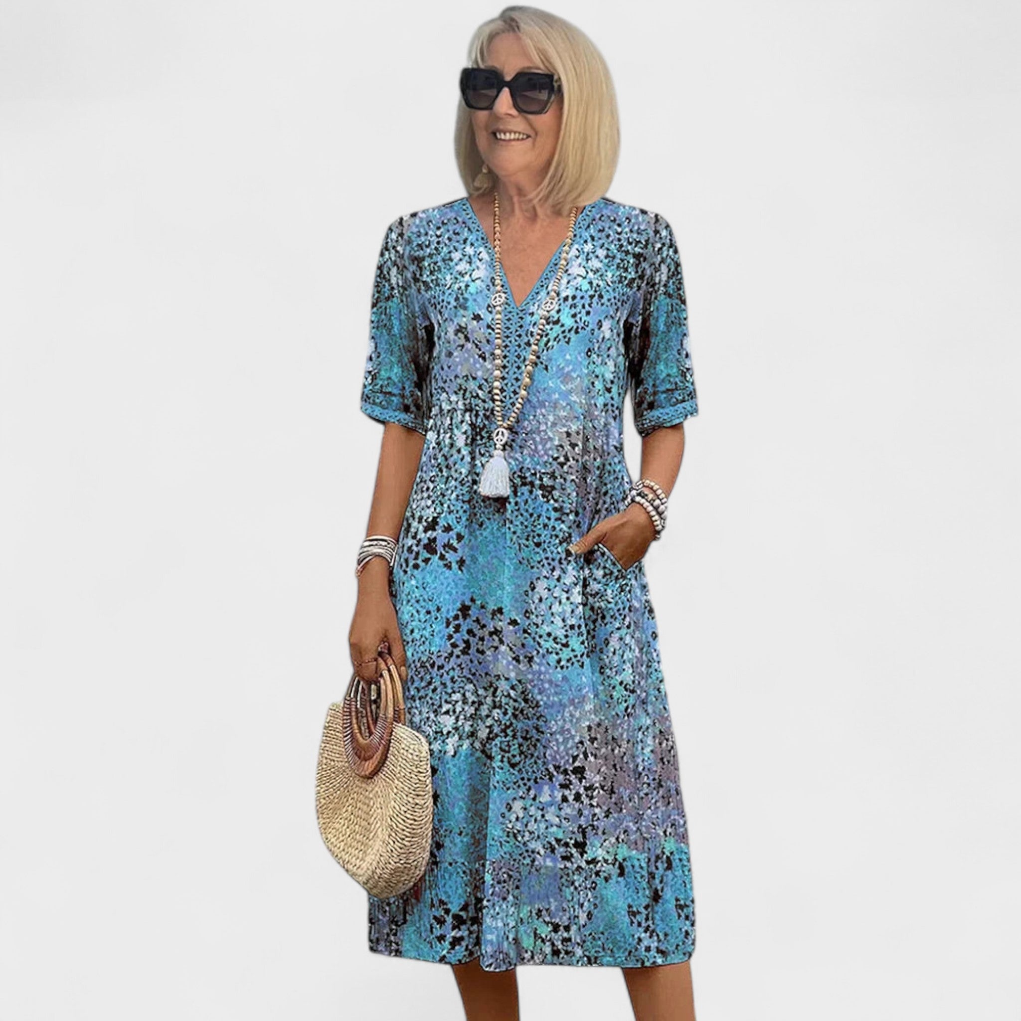 Ova upečatljiva haljina srednje dužine spaja udobnost i stil u jednom. Lagani materijal i ležeran kroj čine je savršenom za tople dane, dok šareni uzorak dodaje dozu živahnosti i elegancije. Može se nositi uz sandale za opušten izgled ili uz modne dodatke za svečanije prilike.