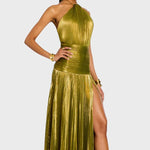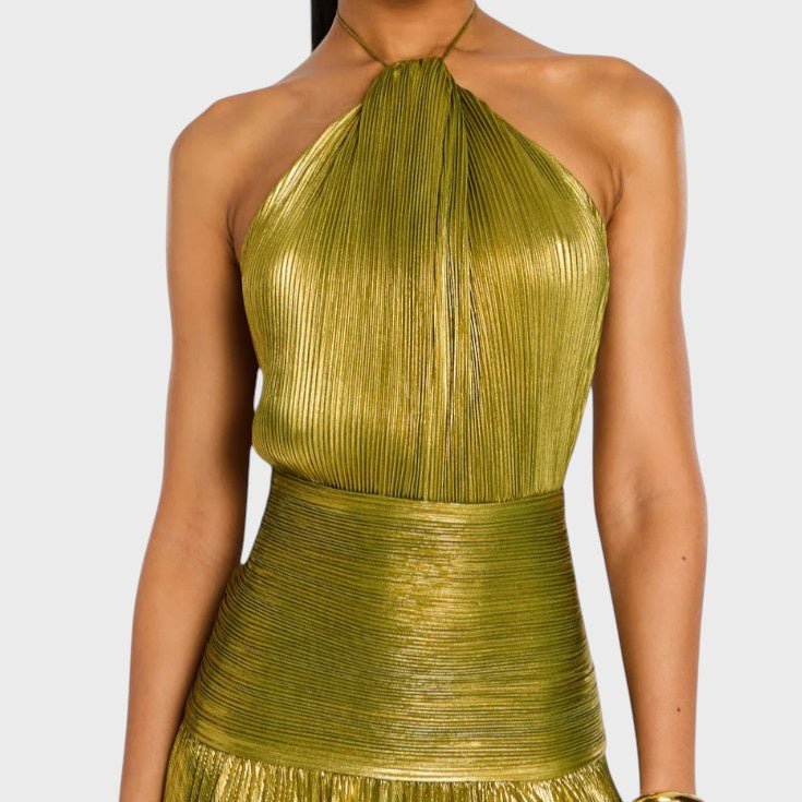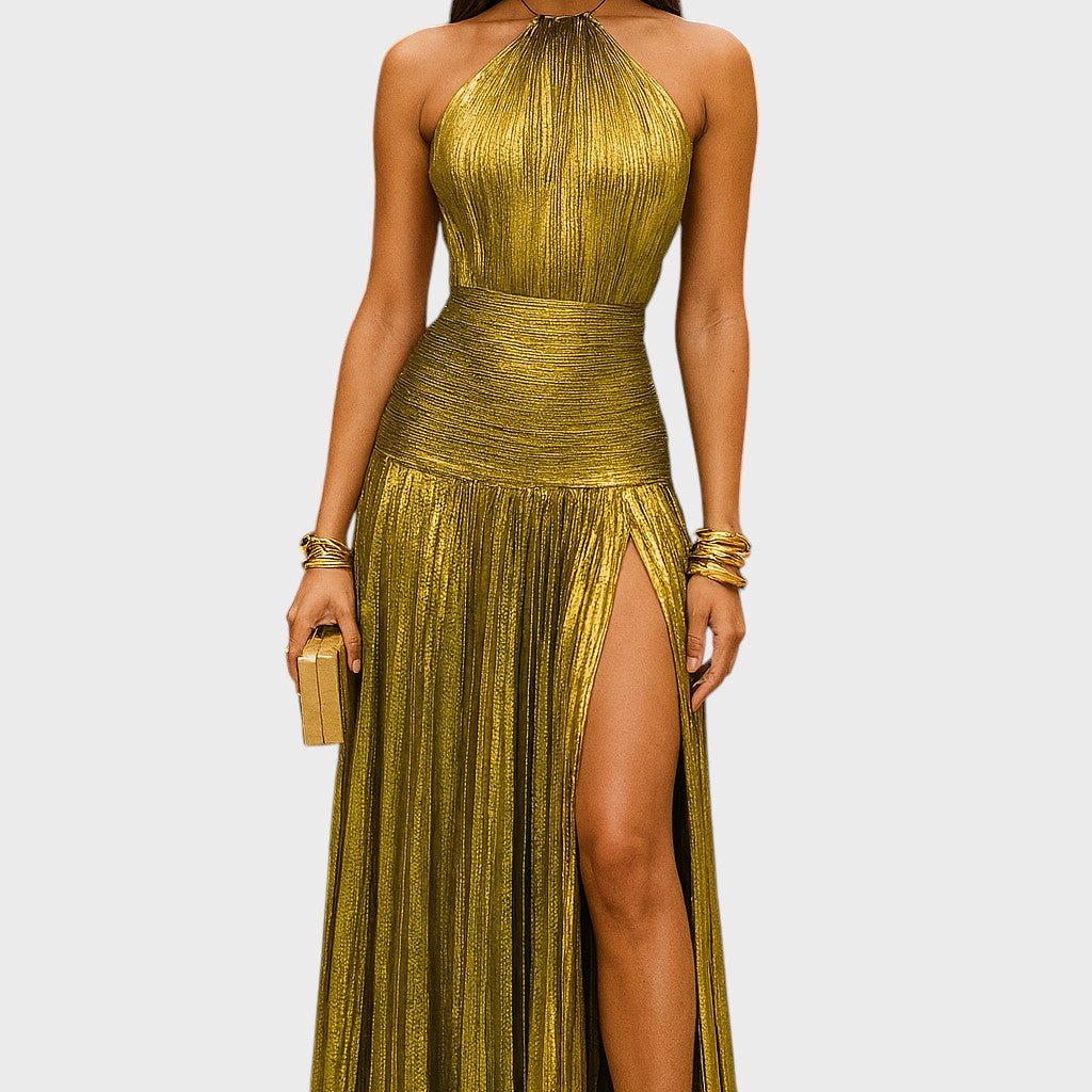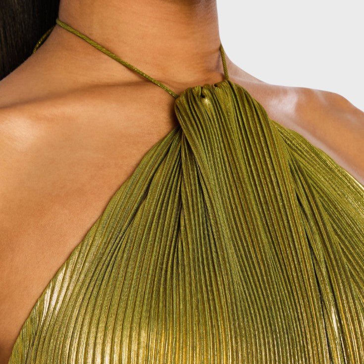 Suknelė Laumė žavi savo metaliniu peridoto atspalviu, plazdančia siluete ir rafinuotais detalėmis. Su halterio iškirpte, atvira nugara ir aukštu skeltuku, ji jungia drąsą ir eleganciją – ideali galoms, vakarienėms ir nepamirštamoms naktims, kupinoms mistikos ir moteriškumo.