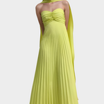 Pabrėžkite savo spindesį ir moteriškumą su šia akį traukiančia maxi suknele ryškiai geltonos spalvos. Jos plisuota tekstūra ir be petnešų dizainas harmoningai apgobia jūsų siluetą, suteikdami elegancijos ir nesuklastotos prabangos kiekvienai jūsų išvaizdai.