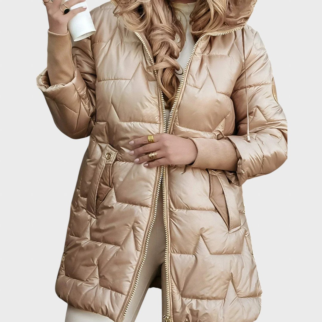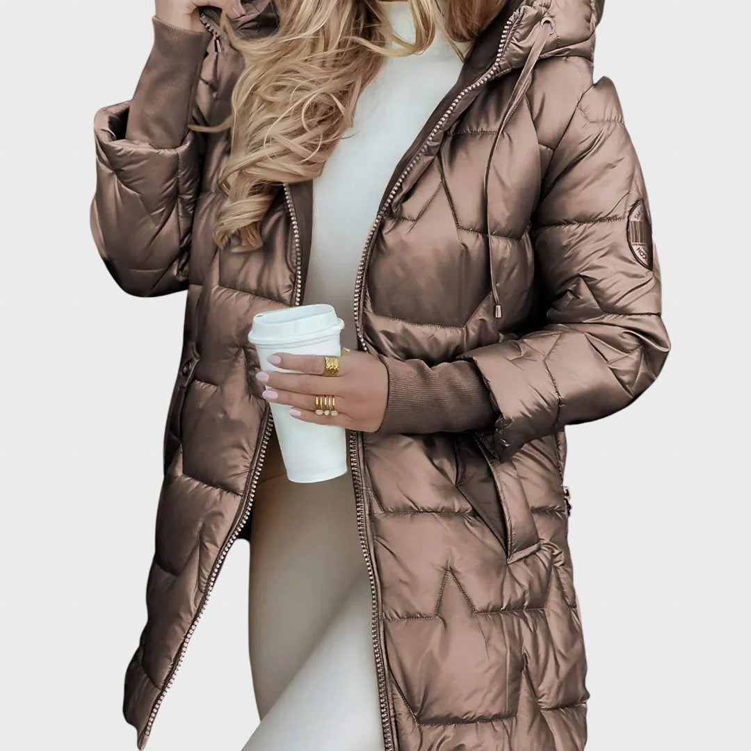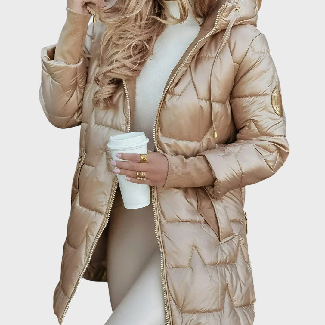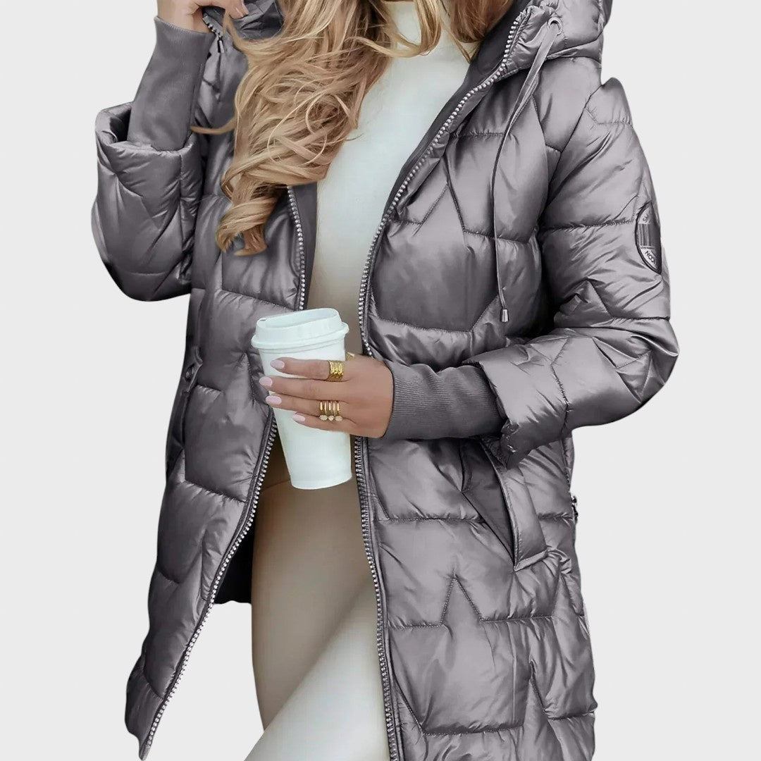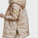 Sniegė | Ilgas ir šiltas dygsniuotas paltas su apgaubiančiu gobtuvu