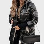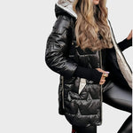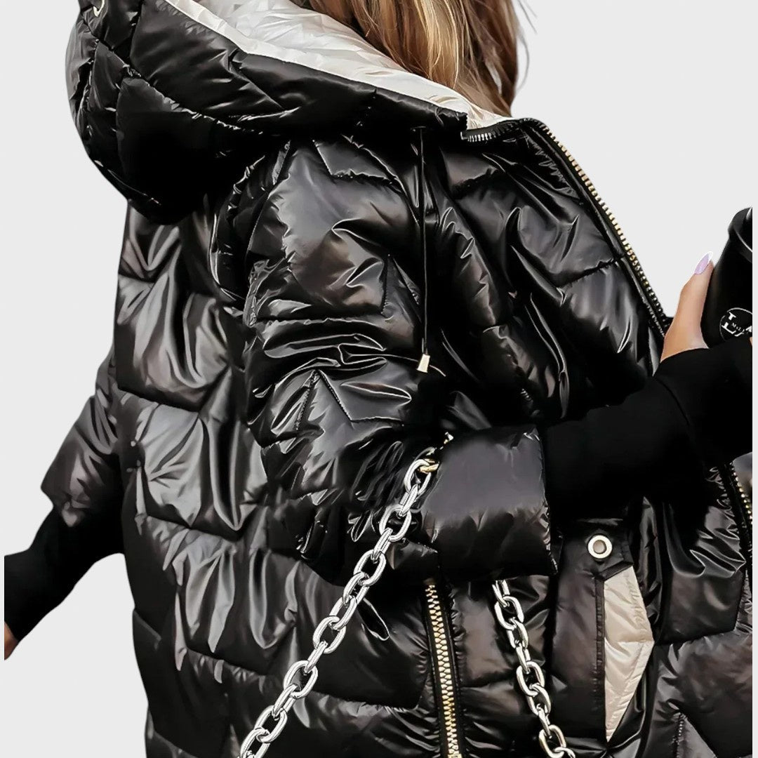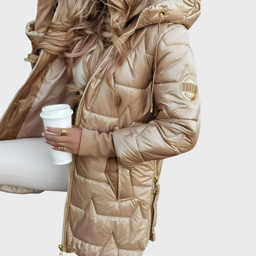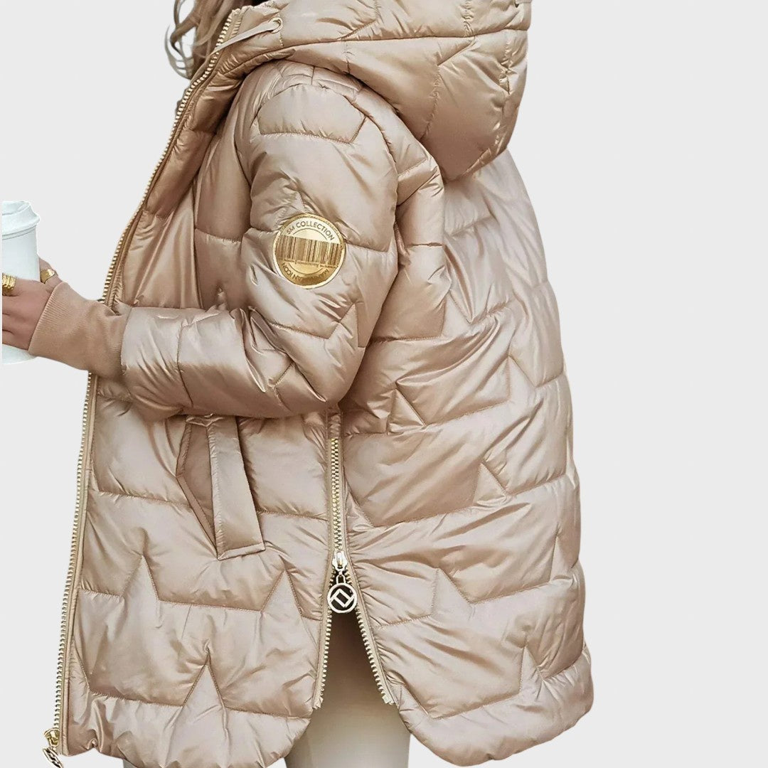 Sniegė | Ilgas ir šiltas dygsniuotas paltas su apgaubiančiu gobtuvu