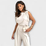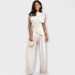 Skulptūrinis elegancija su modernia nuojauta: Sofia komplektas sujungia asimetrinį topą su plačiomis kelnėmis, suteikdamas siluetą, kuris yra elegantiškas ir sklandžiai juda. Puikiai tinka ypatingoms progoms arba norint be vargo pakelti kasdienį įvaizdį.