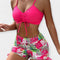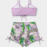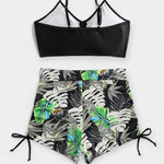 Aukštu juosmeniu bikini su tropiniu raštu ir petnešomis
