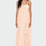 Elegantiška maxi suknelė su sklandžiu judėjimu ir moteriška linija, kuri švelniai apglėbia siluetą. Išskirtinis dekoltė ir plonos petnešos pabrėžia kaklą ir pečius, o juosmens pritaikymas suteikia elegantišką formą. Puikiai tinka vestuvėms, krikštynoms ir kiekvienai ypatingai progai.