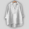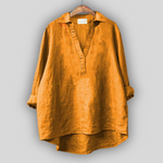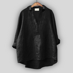 Elegantiška lino palaidinė, kuri skleidžia gaivumą ir laiką nepaisantį stilių. Ji turi V formos iškirptę su diskretiška apykakle, ilgas rankoves, kurias galima sukti, ir asimetrišką apdailą su ilgesne nugarine dalimi, užtikrinančią komfortą ir judėjimo laisvę. Ideali pasirinkimas vėsiems vasaros įvaizdžiams arba elegantiškam kasdieniam stiliui.
