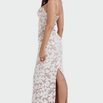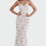 Išskirtinė maxi suknelė su nėriniais gėlių raštu, kuri pabrėžia moteriškumą su elegancija ir laikinu stiliumi. Plonos petnešėlės ir prigludęs kirpimas harmoningai apglėbia siluetą, todėl ji idealiai tinka vakariniams pasirodymams ar ypatingoms progoms. Permatoma nėrinių tekstūra suteikia prabangos ir romantizmo jausmą.