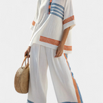 Struktūruota gaiva su jūrinėmis nuotaikomis. Daisy komplektas išsiskiria švariu ir moderniu dizainu, praturtintu rankų darbo detalėmis ryškiomis spalvomis. Plati palaidinė ir plačios kelnės su plačiais kojų kirpimais sukuria laisvą siluetą, kuris perteikia lengvumą ir stilių su asmenybe.