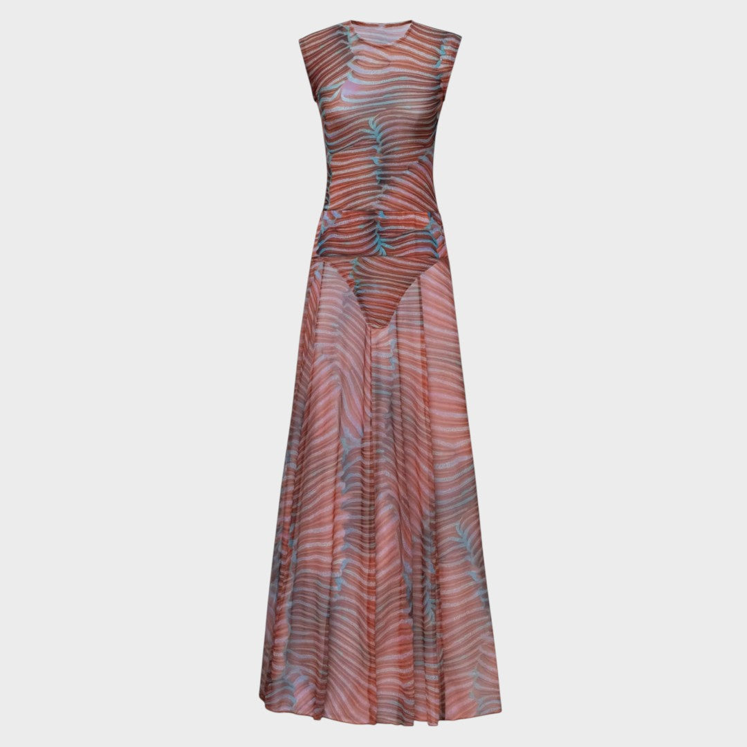 Šis komplektas su bangų raštu šiltose spalvose yra atsipalaidavusios rafinuotumo apibrėžimas. Lengvas audinys sukuria sklandų judėjimą kiekviename žingsnyje, o be rankovių dizainas ir elegantiškas kirpimas natūraliai apgaubia siluetą. Puikus pasirinkimas vakarienėms lauke, paplūdimio šventėms ar ypatingoms progoms, kai norite spindėti su meniniu ir moderniu akcentu.