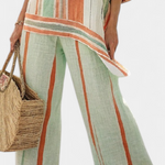 Vasaros gaivumas su menine nuojauta. Daisy komplektas sujungia bluzoną su spalvotais dryžiais, turinčią minkštą ir asimetrišką liniją, su plačiomis kelnėmis. Patogus stilius, kuris skleidžia asmenybę ir spalvą.