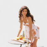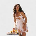 Mini Gėlių Suknelė skleidžia gryną romantiką – su subtiliomis gėlėmis pastelinių atspalvių, halter tipo iškirpte ir lengvo šifono sluoksniais, kurie žavingai krenta. Puikiai tinka sodo šventėms, vasaros brunch'ams ar taurės rožinio vyno po saule.