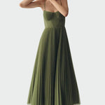 Elegantiška ir moteriška suknelė su plonomis petnešomis ir prigludusia krūtine, kuri pabrėžia siluetą. Plisuota sijonas midi ilgio suteikia unikalų judėjimą ir nepriklausomą eleganciją. Idealu elegantiškoms išvaizdoms, nuo vestuvių iki oficialių renginių.