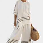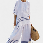 Daisy kombinezonas siūlo puikų komforto ir Viduržemio jūros stiliaus balansą. Pagamintas iš lengvos medvilnės ir lino mišinio, jo plati siluetas su subtiliais atvirais elementais ir dekoratyvinėmis juostelėmis skleidžia nevaržomą gaivumą.