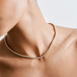 Pridėkite prabangos su Rivière karoliais, padengtais 14k auksu. Šis išskirtinis papuošalas turi nuolatinę blizgančių akmenų liniją, sukuriantį nuostabų ir elegantišką efektą. Puikiai tinka bet kokiai progai, suteikia klasikinį ir prašmatnų akcentą, kad pakeltumėte savo stilių.