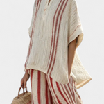 Atsipalaidavimas su jūrinio charakterio akcentais. Daisy kostiumas sujungia plačią palaidinę su V formos iškirpte ir plačias kelnes su vertikaliomis juostelėmis, kurios pailgina siluetą. Jo sklandus dizainas ir audinio medžiaga daro jį idealiu pasirinkimu mėgautis šviesiomis dienomis su komfortu ir stiliumi.
